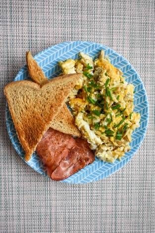 Huevos revueltos con pan tostado.
