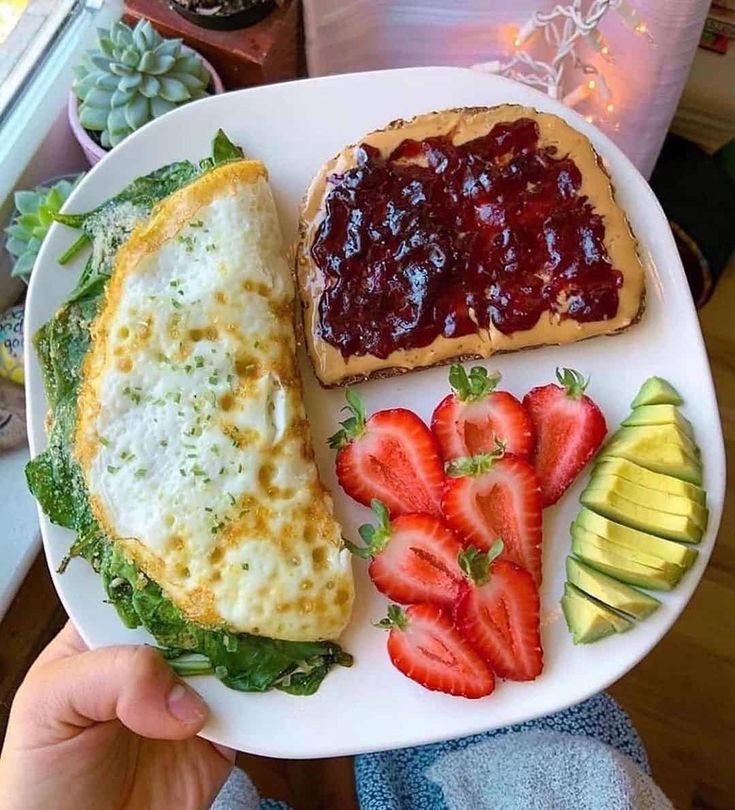 Omelet con espinaca y pan con mantequilla de maní.